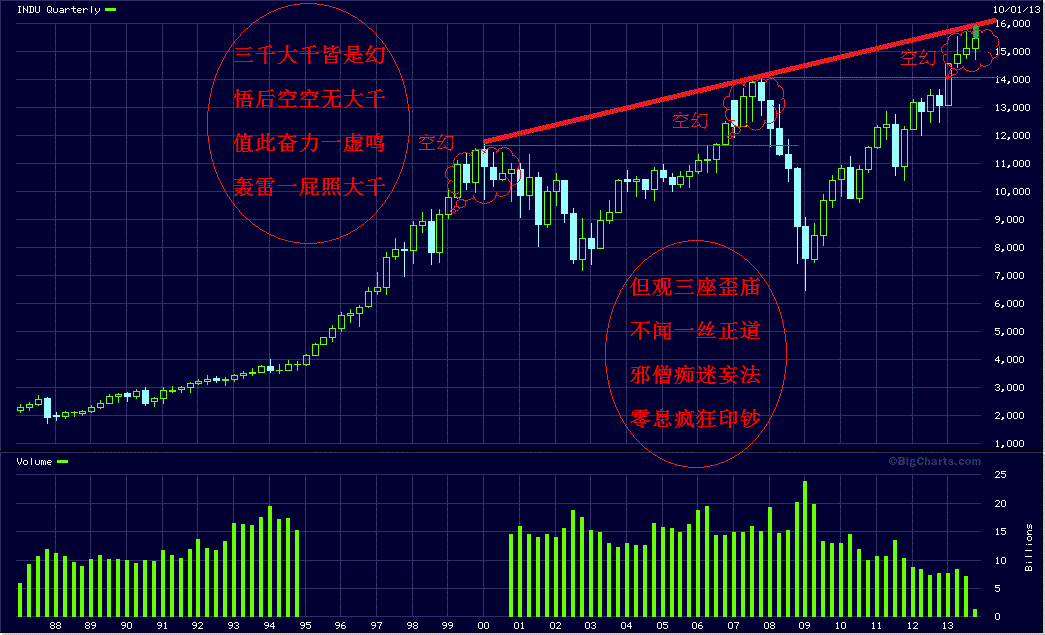 记得,2008年,当股市下跌时,多伦多华人报纸上全是批评美国的文章。用词最多,印象最深的是“寅吃卯粮”。一时间,社会上真是不乏大彻大悟之能人也。可是,当联储“量化宽松”后,开始“寅吃辰、巳、午、未、申、酉、戌、亥粮”时,面对一个人造上涨的股市,当初那些大彻大悟的批评家们却都不敢作声了。原来,他们只会在股市下跌时,“惶恐滩头说惶恐,零丁洋里叹零丁。”