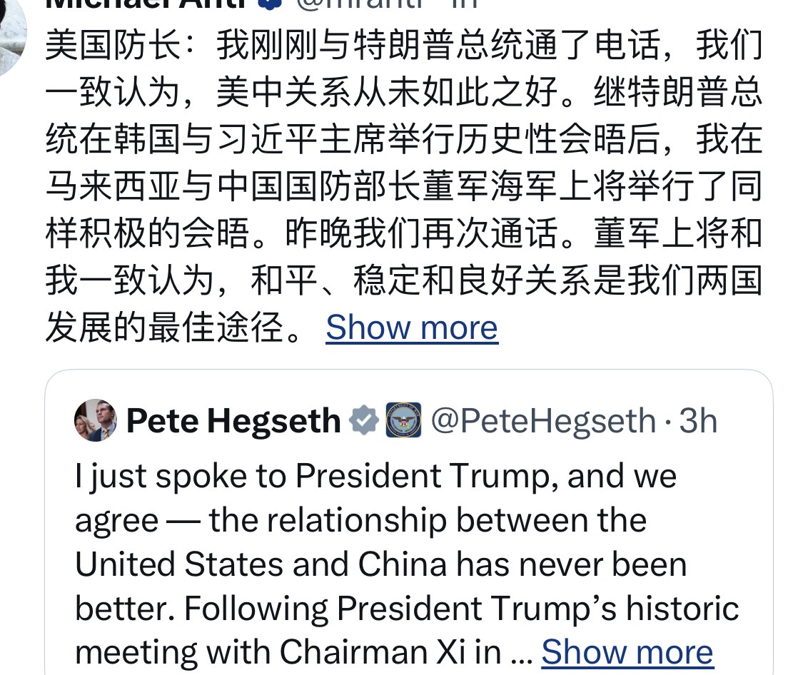 峰会上,中国元首高度赞扬美国总统川普第二任期以来,在解决包括中东冲突在内的国际关系上的努力和效果,称其为‘和平总统’。美国总统川普则一起即往,不脸红地吹捧中国及其元首的个人魅力。称其为伟大的领袖,羡慕嫉妒恨的表现是文字难以表述的。